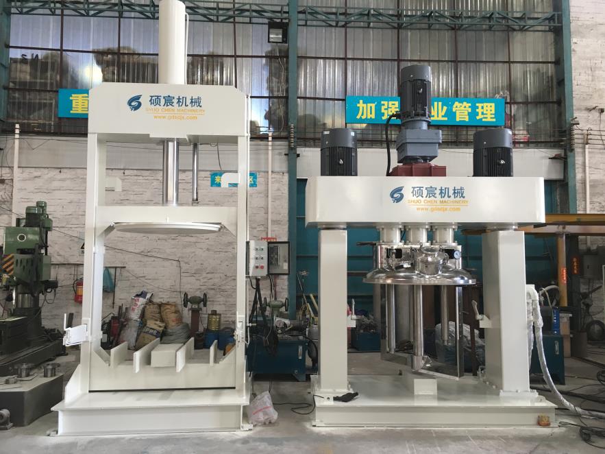 強(qiáng)力分散機(jī)主機(jī)1臺(tái)(攪拌機(jī)),液壓出料機(jī)1臺(tái)(選配,大容量的不配),料缸2個(gè),高粘度齒輪出料泵1臺(tái)(選配),真空泵1臺(tái)(選配),控制電柜2個(gè)(攪拌機(jī)與壓料機(jī)獨(dú)立控制),液壓站2臺(tái)。